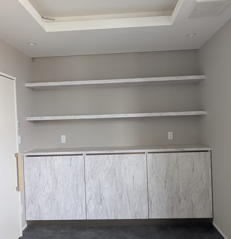 棚板は壁との接地面にスレ桟を回して、飾る物の重量に耐えれるように加工してあります。