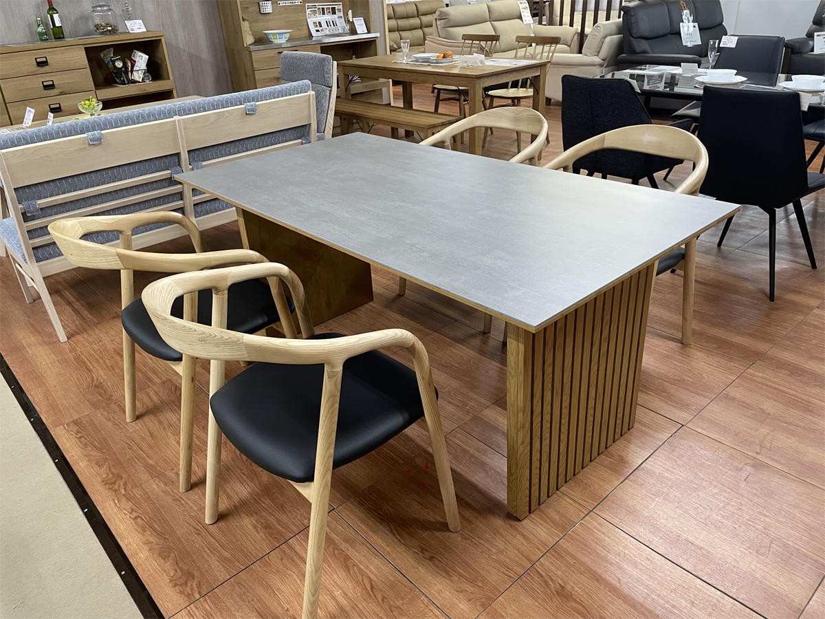 上質で高級感あるセラミック天板と温かみのある木脚をミックスさせた新しいスタイルのダイニングテーブル
